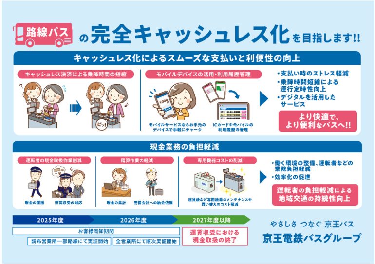 上のプレスリリースによると、バスの完全キャッシュレス化計画は調布営業所管内路線での実証実験から開始し、2027年度を目途に「運賃収受における現金扱いを終了」するという。