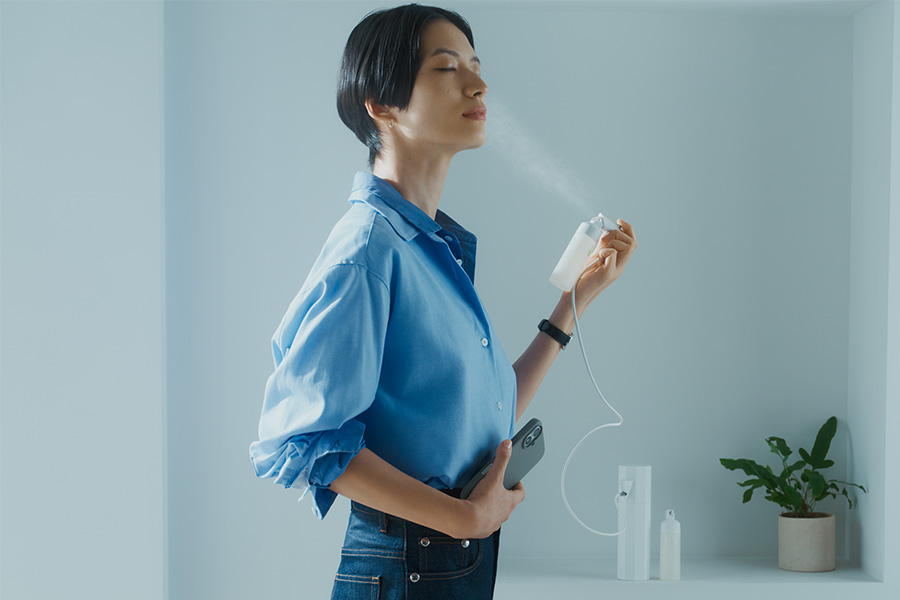 専用デバイスから高濃度炭酸ミストを噴霧し、化粧水を超微細な状態で肌に届ける仕組みで、これまでに5種類の化粧水を展開してきた。