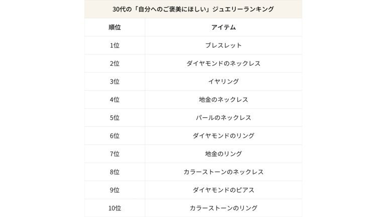 30代では、ブレスレットに加え、ダイヤモンドのネックレス・リングの存在感が増し、長く使える本格ジュエリーをご褒美として選ぶ傾向が強まっているよう。