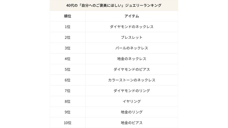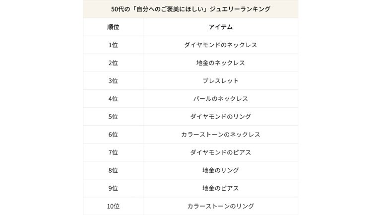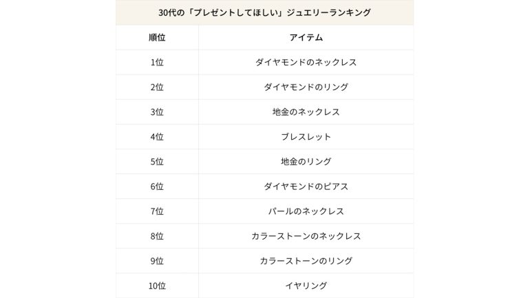 30~50代では、ダイヤモンドのネックレス・リング・ピアスに、地金やパールのネックレスが続き、フォーマルから日常までカバーできる大人のための定番ジュエリーが選ばれていることが分かる。