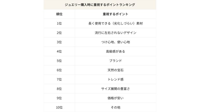日常的に身につけるジュエリーだからこそ、劣化しにくい素材や体型・スタイルに合うサイズ感を重視する実用目線が強く見られた。