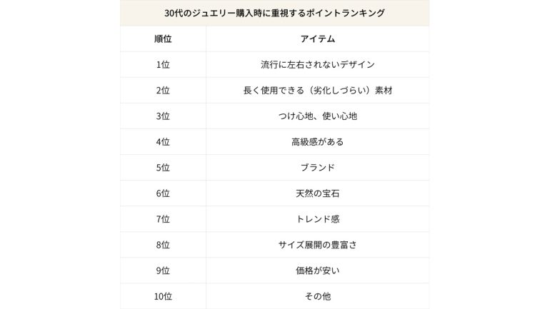 20~30代は「つけ心地・使い心地」や「流行に左右されないデザイン」を重視する傾向が強く、初めての本格ジュエリーでも長く使える失敗しない一本を選びたい意識が見られる。