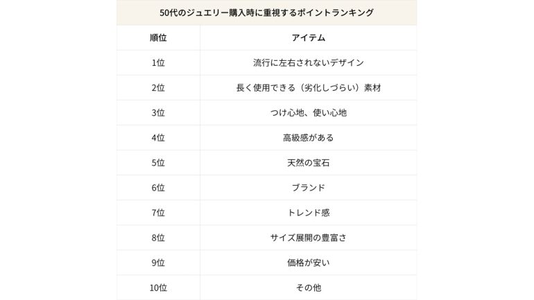 40~50代では「長く使える素材」「つけ心地」に加え、「サイズ展開の豊富さ」を重視する傾向がより顕著に。