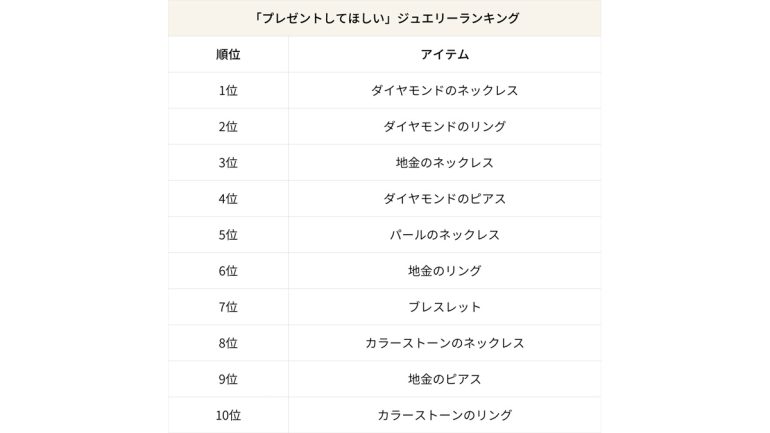 全体ランキングでは、「プレゼントでもらえたら嬉しい」と最も多く選ばれたアイテムはダイヤモンドのネックレスであった。