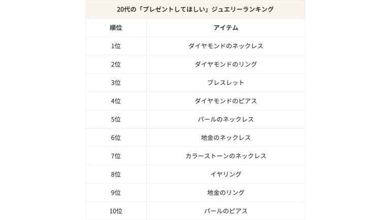 年代別に見ると、20代ではダイヤモンドのネックレスとリングが上位に入り、「初めての本格ジュエリーを記念として贈られたい」という憧れが強い傾向が見られた。