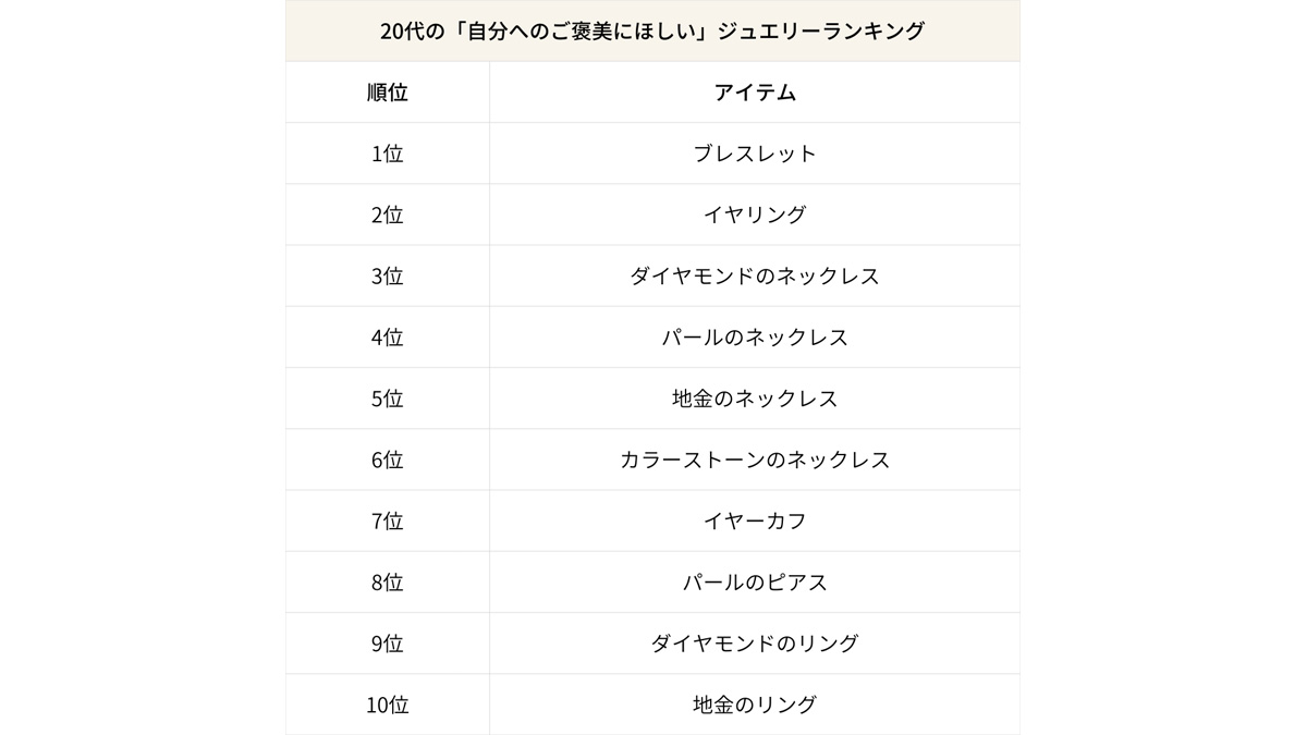 これらの変化から、20代では耳まわりの華やかさだけでなく、手元や首元のジュエリーをご褒美として意識する動きが広がっていると考えられる。