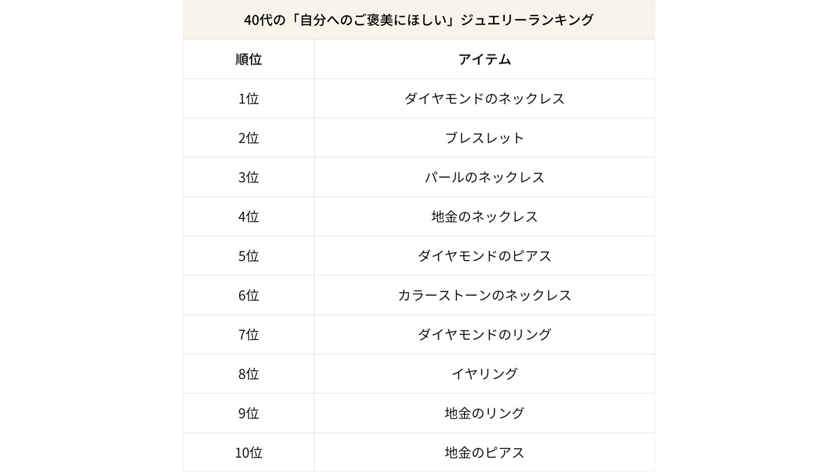 全体ランキングでは、「自分へのご褒美にしたい」と最も多く選ばれたアイテムも、ダイヤモンドのネックレスであった。1本で装いの印象が変わり、特別感も日常使いもしやすいことから、自分で購入するご褒美ジュエリーとしても世代を問わず支持されているようだ。
