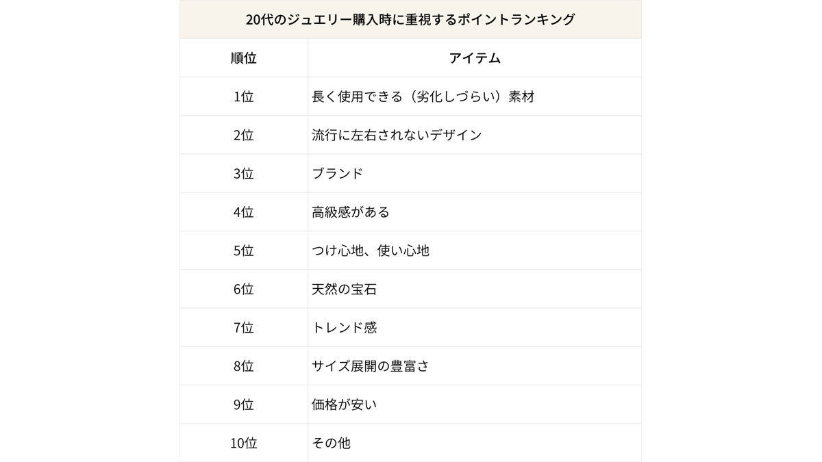 20~30代は「つけ心地・使い心地」や「流行に左右されないデザイン」を重視する傾向が強く、初めての本格ジュエリーでも長く使える失敗しない一本を選びたい意識が見られる。