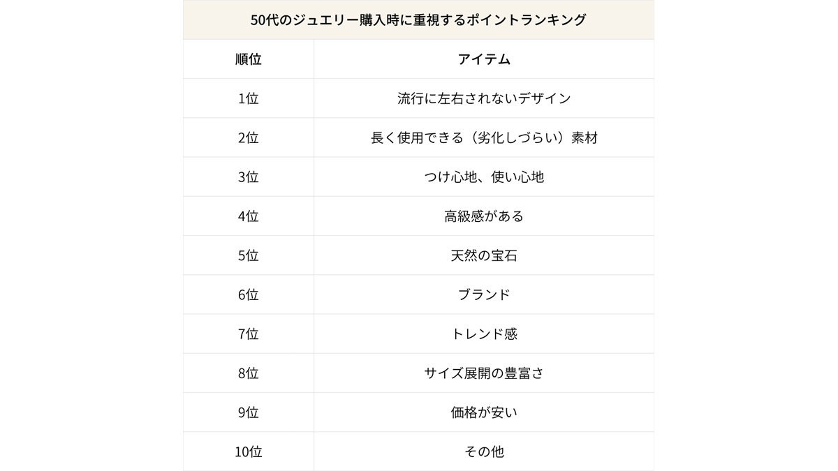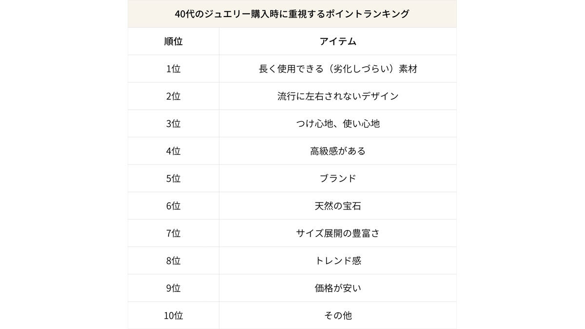 40~50代では「長く使える素材」「つけ心地」に加え、「サイズ展開の豊富さ」を重視する傾向がより顕著に。