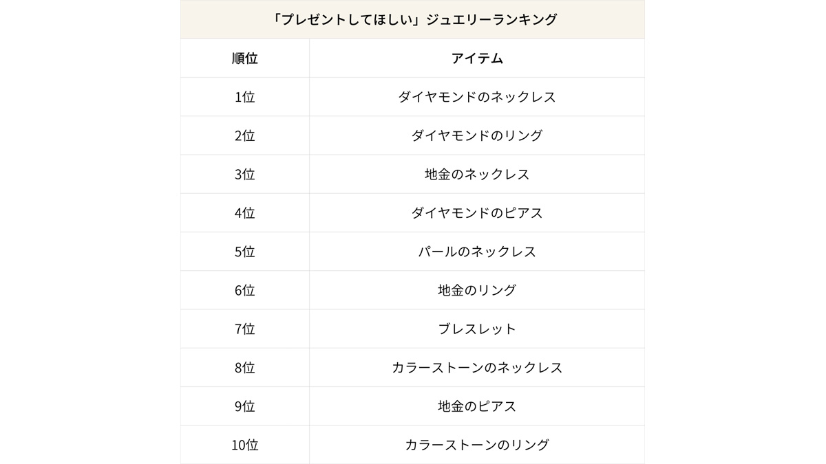 これに対し、「プレゼントしてほしい」ランキングでは、ダイヤモンドのリングが2位となり、ブレスレットは7位に順位を下げている。