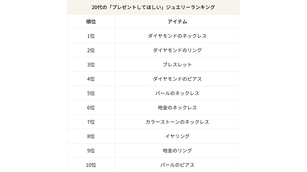 年代別に見ると、20代ではダイヤモンドのネックレスとリングが上位に入り、「初めての本格ジュエリーを記念として贈られたい」という憧れが強い傾向が見られた。