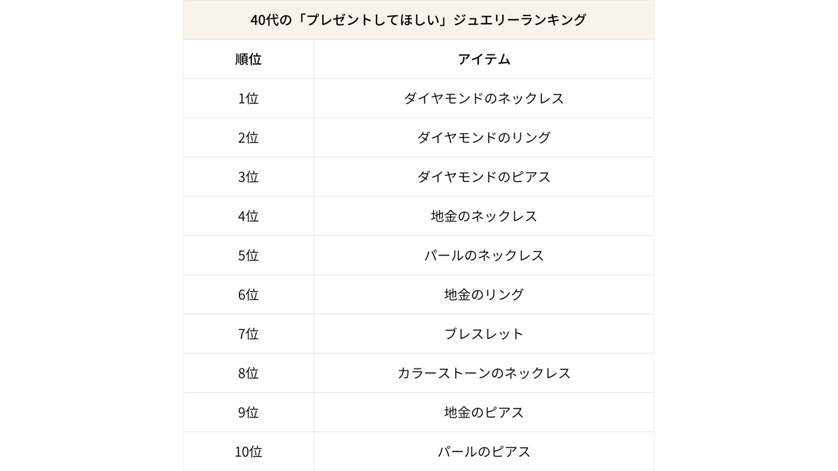 30~50代では、ダイヤモンドのネックレス・リング・ピアスに、地金やパールのネックレスが続き、フォーマルから日常までカバーできる大人のための定番ジュエリーが選ばれていることが分かる。