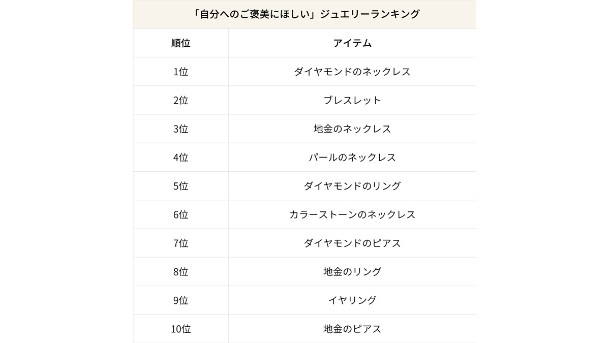 一方で、ダイヤモンドのリングやカラーストーンのネックレスなど、特別感のあるアイテムも上位に入りした。「がんばった自分に、特別なジュエリーを贈りたい」という思いもうかがえる。