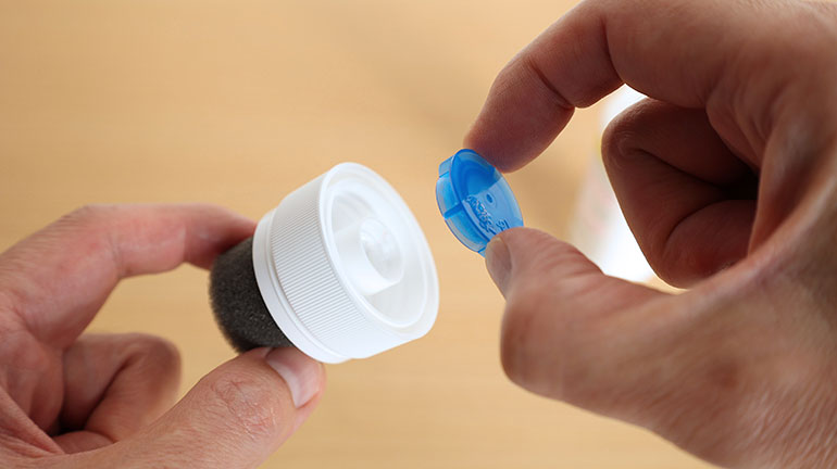 本商品の特徴は、洗剤と抗菌スポンジが一体化した形状にある。革靴の艶出しに使う液体靴クリームを思い出したが、構造としてはそれに近い。購入したらまず、キャップ全体を回していったん外し、青い内蓋を取り除く。