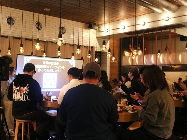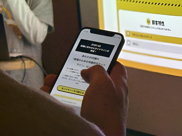 飲酒者の状態や、大地震が起こった時の心構えなどの防災に関するレクチャーを受けてから、自身の店の条件を入力し「酒場のための地震防災ガイドライン」を生成。静岡県からの参加者は「海から近く津波の危険性もあるため、ガイドラインは災害時の対応がわかりやすい」と話していた。