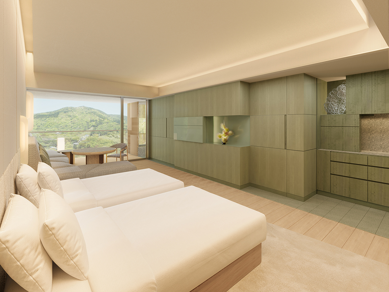 ホテル全体のデザインは、フランス出身デザイナーのグエナエル・ニコラ氏が率いるデザインスタジオ「キュリオシティ」が担当。“Forest Hideaway”をコンセプトに、強羅の豊かな自然環境と調和する、洗練された空間を創出する。