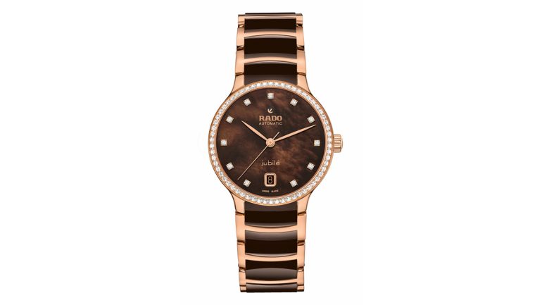 ローズゴールドカラーのブレスレットには、ポリッシュ仕上げのブラウンハイテクセラミックのミドルリンクをあしらい、贅沢な印象をまとう一方で、ジュエリーのようなサイズ感が均整の取れた美しさを際立たせている。