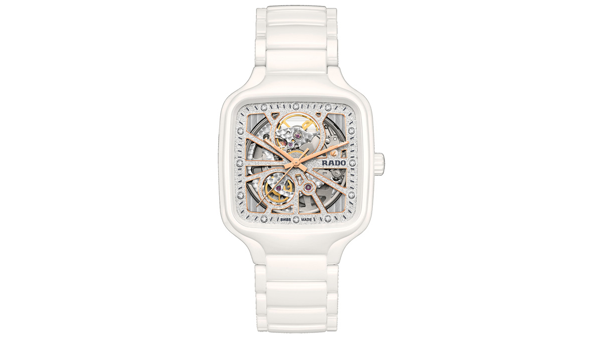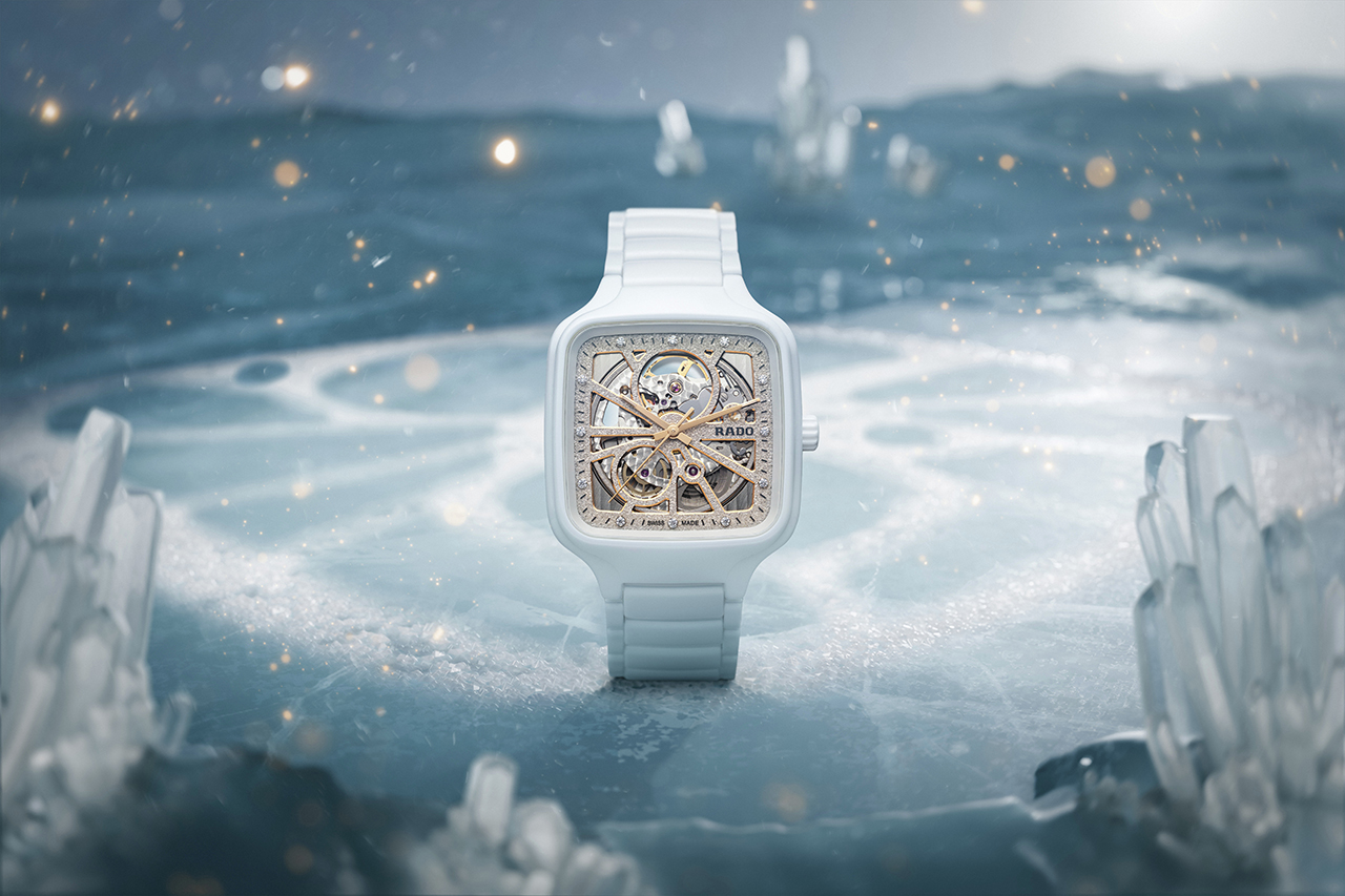 真っ白に輝くポリッシュ仕上げのハイテクセラミック製ケース、リュウズ、ブレスレット、ロジウムカラーのダイヤルには、ダイヤモンドの輝きを想わせるラドー独自のパウダー状仕上げが施され、さらに12個のダイヤモンドインデックスが雪片のきらめきと山岳の冷気を美しく表現した。