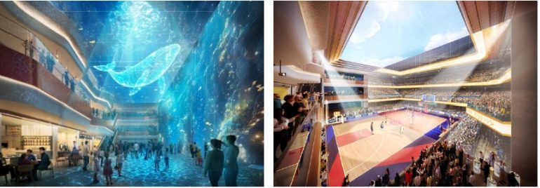 本タワー低層部に位置し、日比谷公園とつながる大規模なパサージュ・アトリウム空間である(仮称)Cross Gateには、壁面・天井一体型の大型LEDビジョンが実装され、巨大な屋内プレゼンテーション&エンターテイメント空間が広がる。
