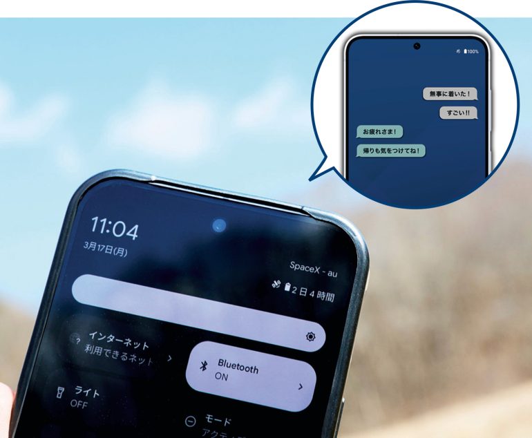 スペースX社のスターリンク衛星とスマホが直接通信できるKDDIのサービス。通信圏外でも空が見えれば、テキストの送受信、写真、動画、電子ファイルの共有が行なえる。「データ通信は世界初の取り組み。国内提供はKDDI1社という点も強みになりました」(事業企画部・本間寛明さん)。対応機種を使うauユーザーは申し込み不要で、当面は無料での使用が可能。他社ユーザーも、「au Starlink Direct専用プラン+」(月額1650円)に申し込むことで利用できる。