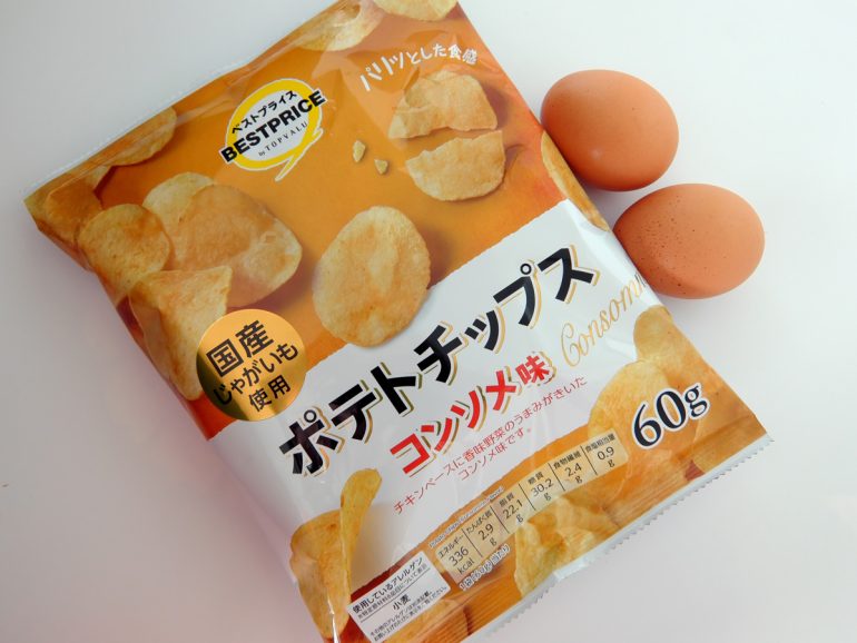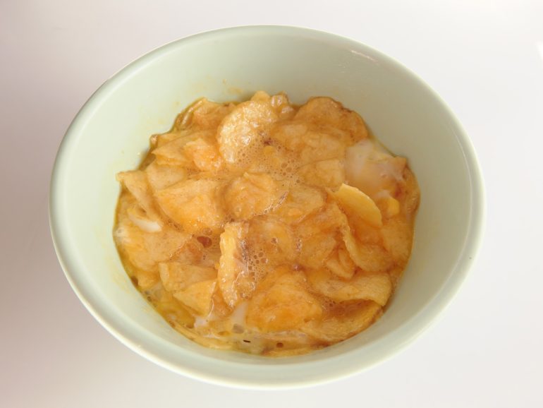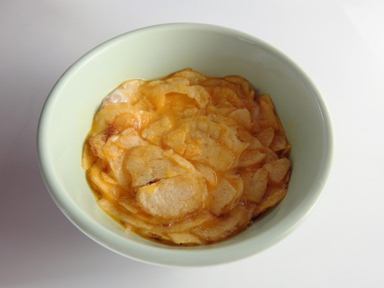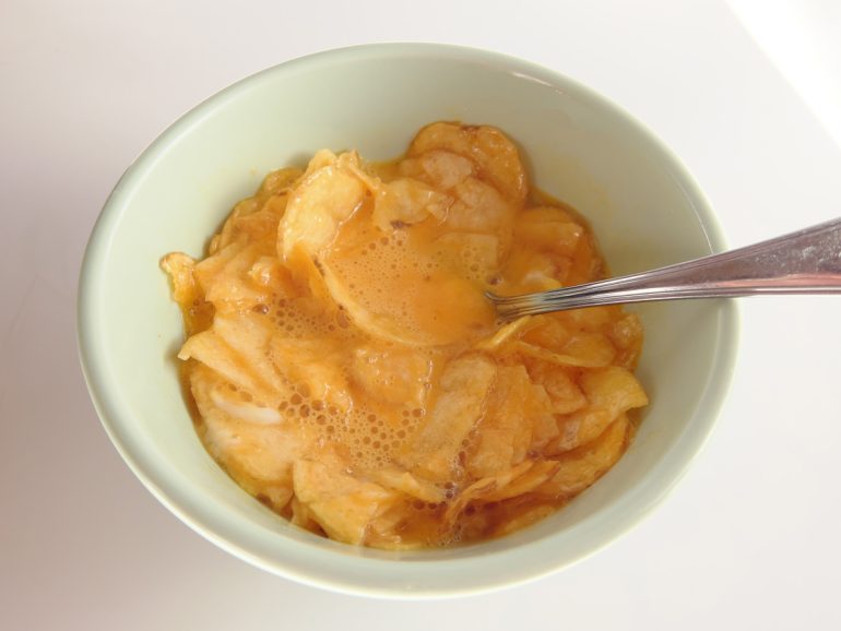味はポテトチップの塩分だけで薄めではありますが、ちゃんとした味になってる所がまた楽ちん。ま、使ったポテトチップの味によって、できた時の塩っけも変わってくるので、いざ食べてみてもっと塩分強い方が「いい!」って人は塩かけたり、ケチャップ付けたり自由にしてください。