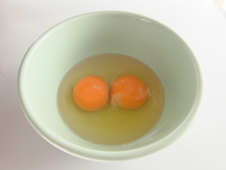 ↑そこに水を卵1コ分くらい入れる。「卵一個分くらいの水の分量っていわれてもわかんね~よ」とお思いでしょうが、さっき割ったばかりの卵の殻あるじゃん? あの殻に水を入れて、それを2杯入れりゃ、だいたい卵一個分の水の量だ。それでOK! でも水を入れても卵と水は混ぜないでね。ただ水を入れただけにしておく。