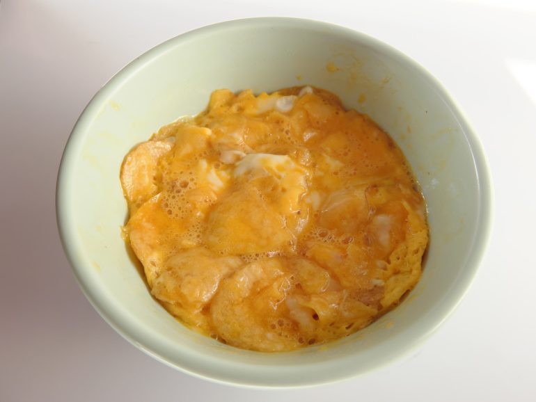 ただ!! 卵の大きさとか、器の形状、電子レンジの個別のちょっとしたパワーの差なんかで固まり具合も違ってくるので、まだ固まり具合が弱いと思ったら10秒くらいずつ加熱して様子を見てください。