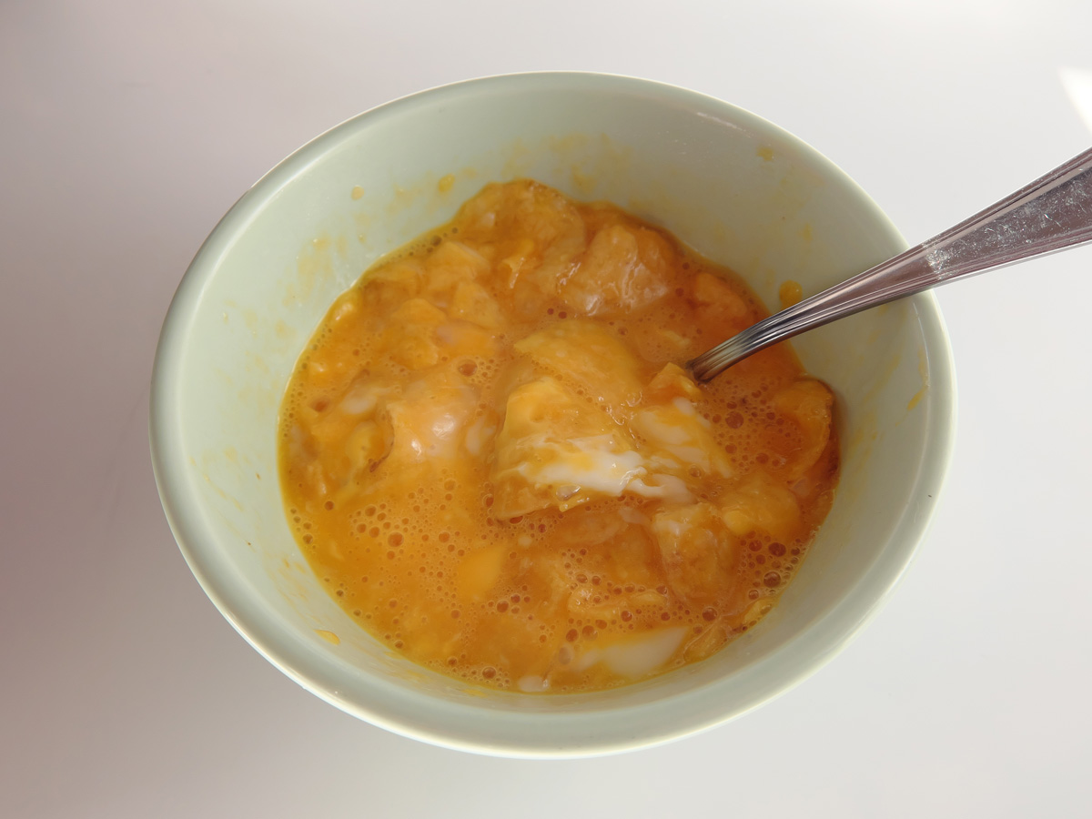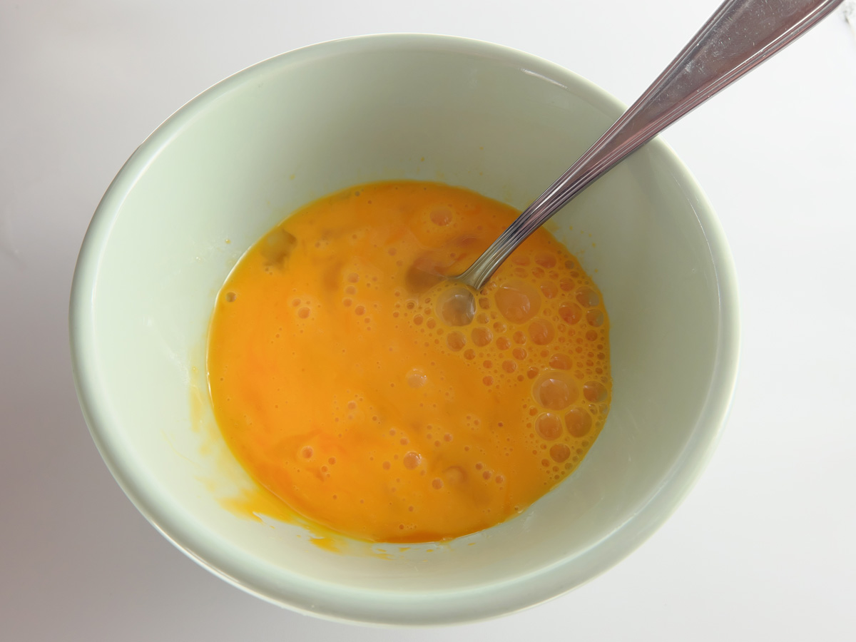 ↑卵をほぐす。卵かけゴハンにかけるくらいの混ぜ方にしておけばいいです。