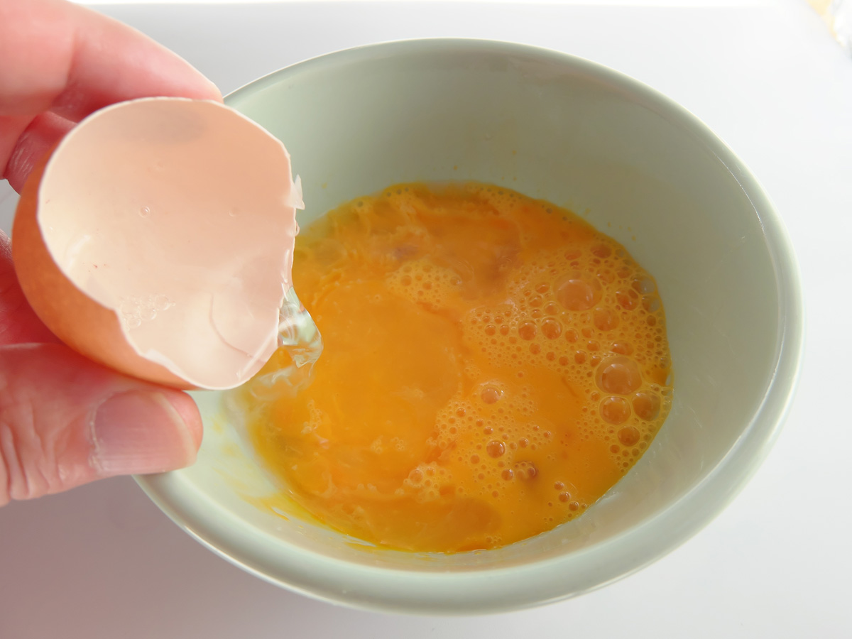 ↑そこに水を卵1コ分くらい入れる。「卵一個分くらいの水の分量っていわれてもわかんね~よ」とお思いでしょうが、さっき割ったばかりの卵の殻あるじゃん? あの殻に水を入れて、それを2杯入れりゃ、だいたい卵一個分の水の量だ。それでOK! でも水を入れても卵と水は混ぜないでね。ただ水を入れただけにしておく。