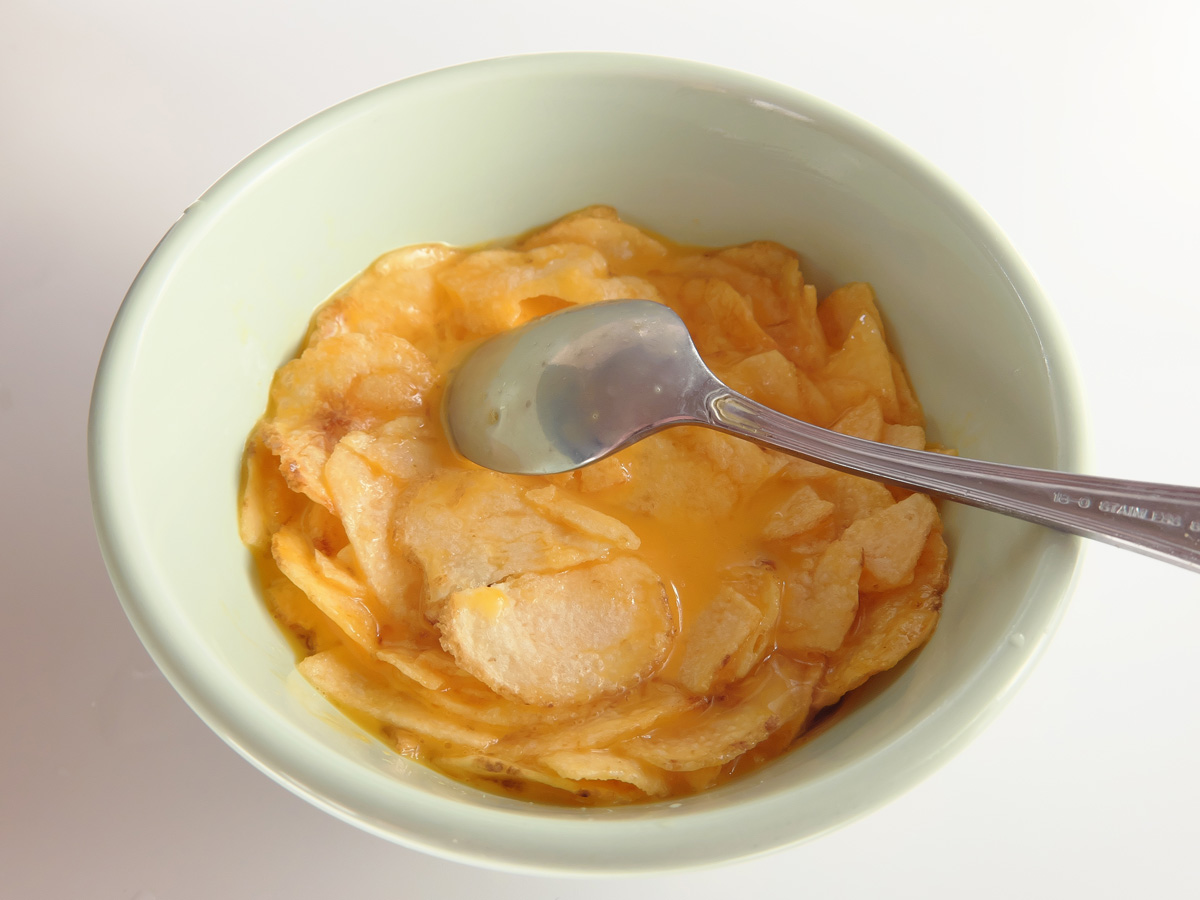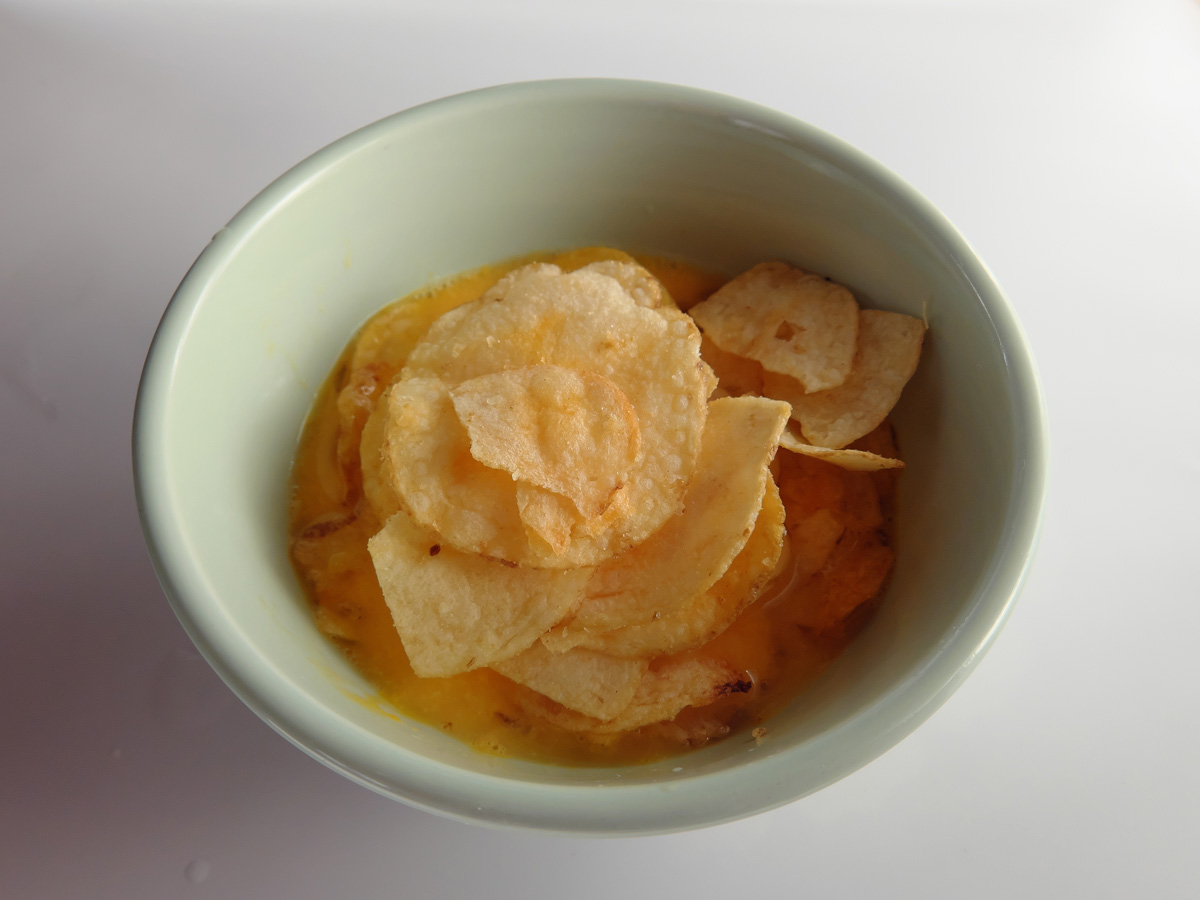 味はポテトチップの塩分だけで薄めではありますが、ちゃんとした味になってる所がまた楽ちん。ま、使ったポテトチップの味によって、できた時の塩っけも変わってくるので、いざ食べてみてもっと塩分強い方が「いい!」って人は塩かけたり、ケチャップ付けたり自由にしてください。