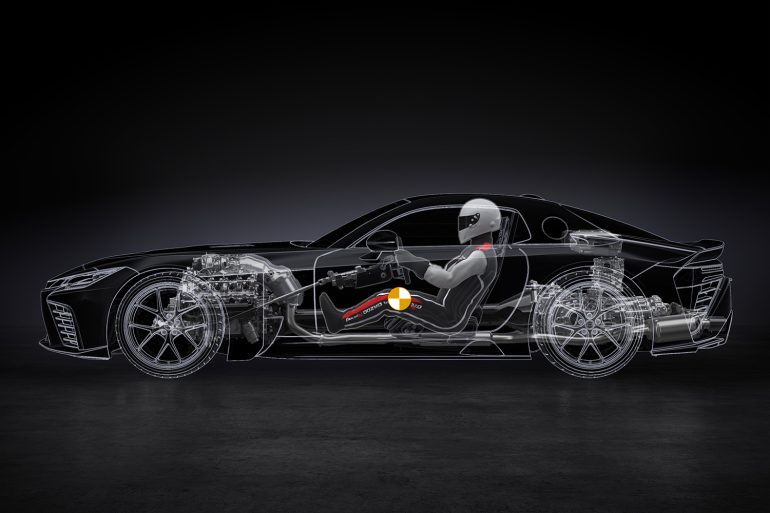 GR GTの開発にあたっては、徹底した低重心化を目指し、全高とドライバーの位置を極限まで下げようと考えることからスタート。駆動方式は限界領域までの扱いやすさを考え、FR(フロントエンジン・リヤドライブ)が採用された。ドライサンプ方式を採用した4L V8ツインターボエンジンや、リヤに搭載したトランスアクスルのほか、ユニット類の最適配置によって、重量物の重心位置を大幅に引き下げられた。そしてドライバーとクルマの重心をほぼ同じ位置にしている。それはクルマとドライバーの一体感と扱いやすさを高めるために理想的なドライビングポジションを追求した結果。