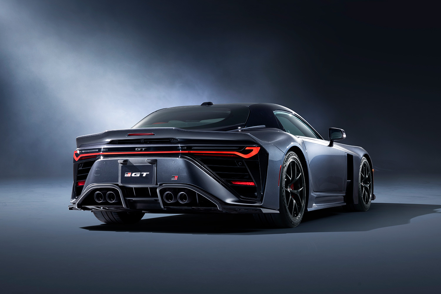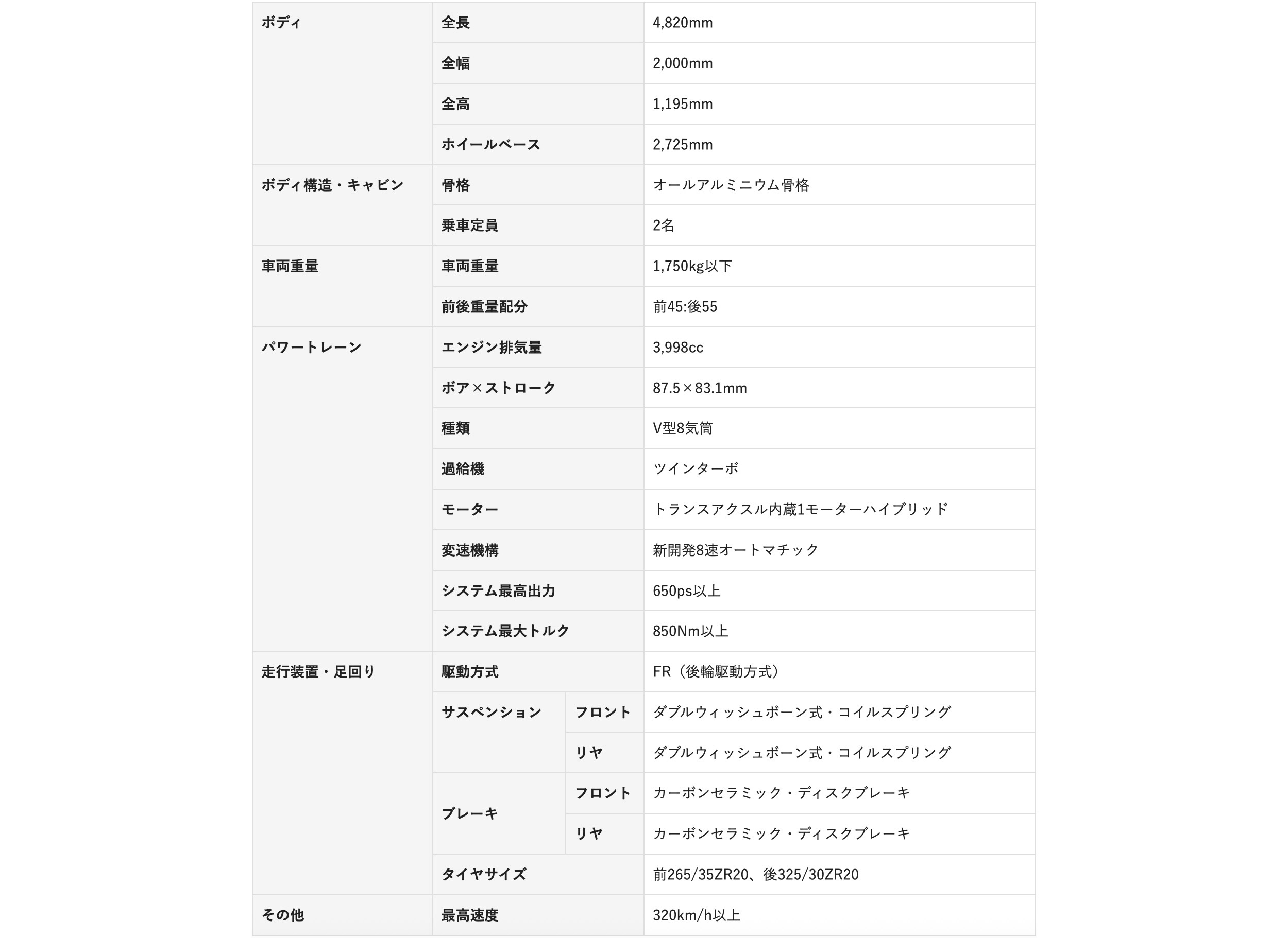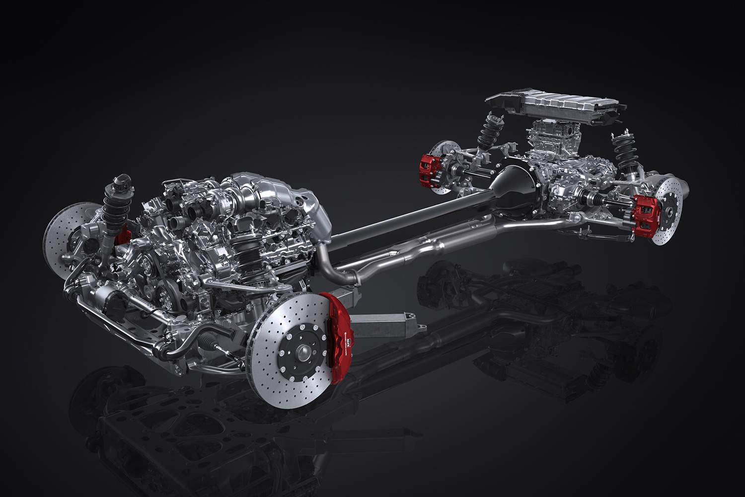 GR GTは新開発の4L V8ツインターボと1モーターのハイブリッドシステムを搭載。システムの最高出力は650ps以上、システム最大トルクは850Nm以上(開発目標値)だが、そうした圧倒的なパフォーマンスはもとより、低重心、軽量・高剛性、空力性能の追求の3つのキー要素にもこだわっている。