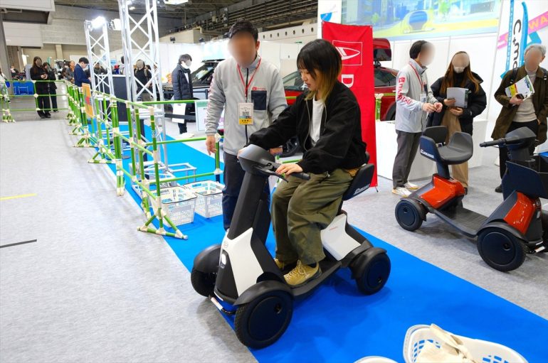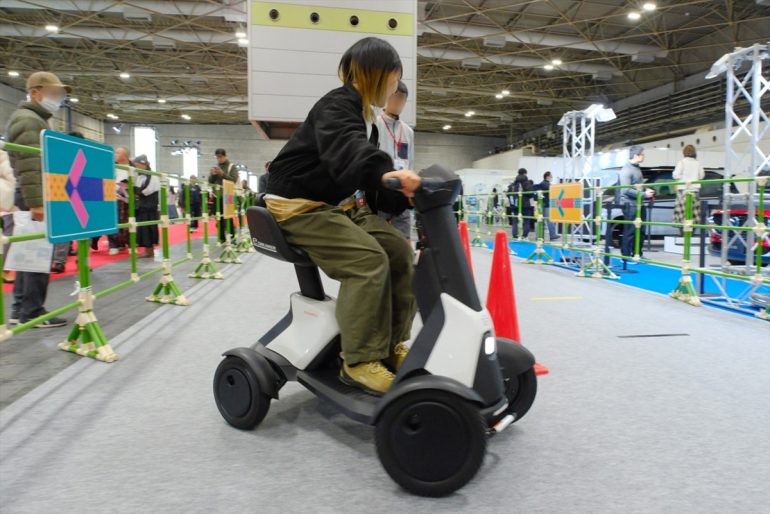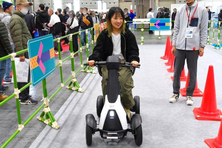 今回は会場内に設置された、1周20mほどのコースを4周まわりました。まずは慣らしでゆっくりと、時速3kmで進みます。第一印象で感じたのは、電動ならではのスムーズな発進と静かな走行音。まるですべるように走れるのです。
