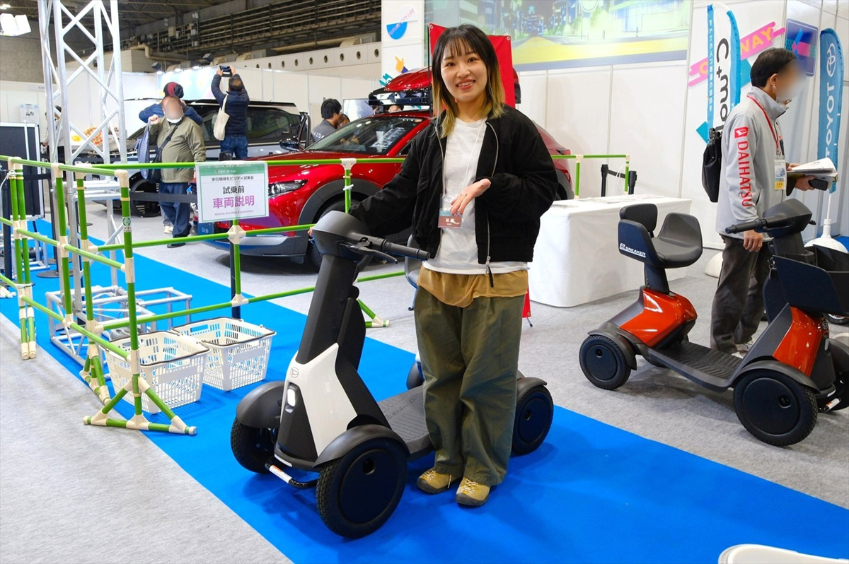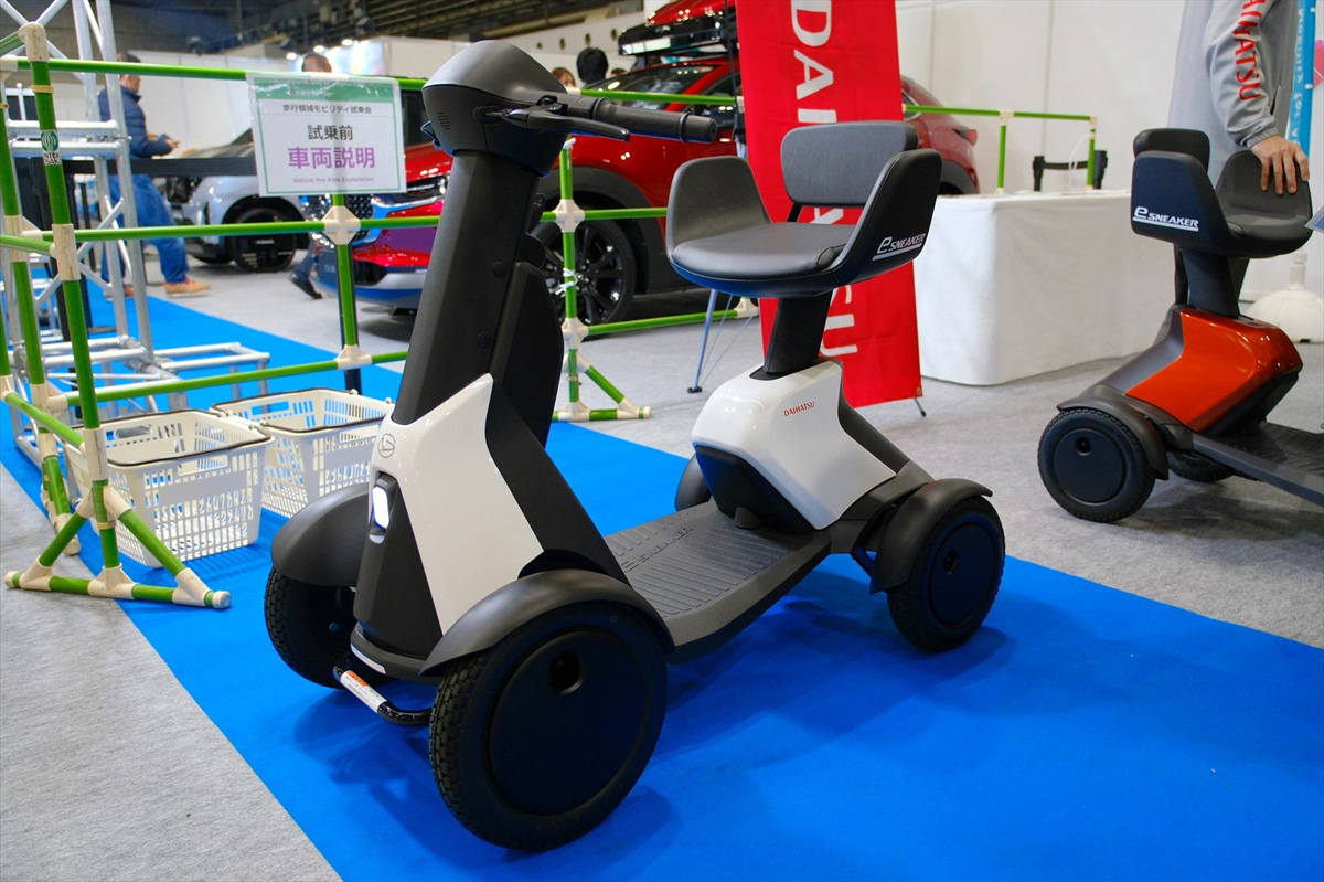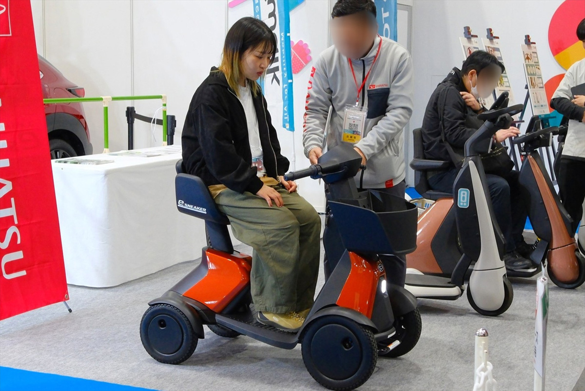 そんな中、試乗車として展示されていたのが電動の1人乗り4輪車『e-SNEAKER(イースニーカー)』。シニアカーとして使えるのにスタイリッシュ、誰でも簡単に乗れる歩行領域モビリティです。