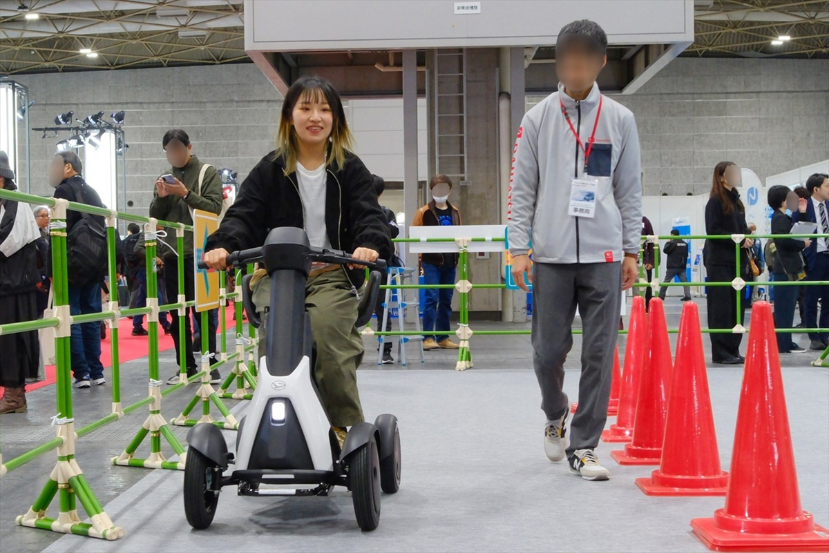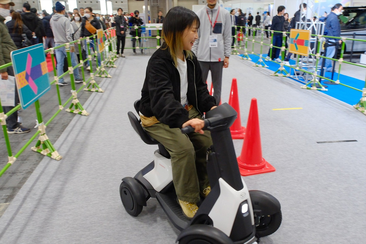 今回は会場内に設置された、1周20mほどのコースを4周まわりました。まずは慣らしでゆっくりと、時速3kmで進みます。第一印象で感じたのは、電動ならではのスムーズな発進と静かな走行音。まるですべるように走れるのです。