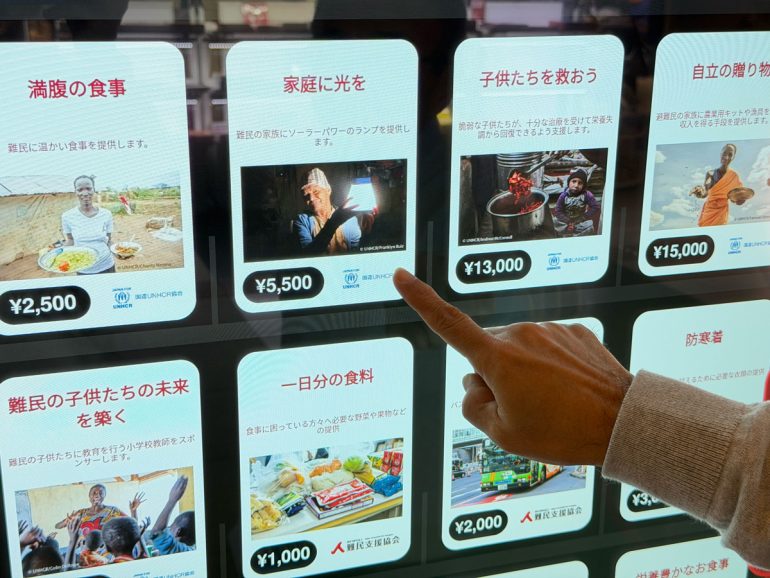 体験型寄付機と言われてもピンとこないと思うが、自動販売機の筐体をイメージするとわかりやすい。タッチパネルで操作でき、協力チャリティ団体が提供する30種類の支援アイテムの中から、寄付者自身が「贈りたい」内容を選べる。寄付金は100%、各団体を通じて支援先に届けられ、寄付の透明性と「贈る体験」の双方が評価されている。