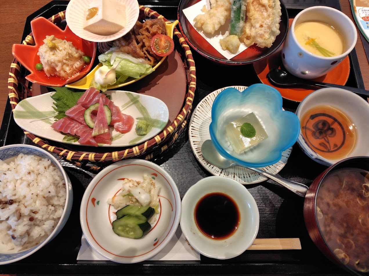 幅広い年代に人気の木曽路でも株主優待が使える。写真は平日ランチの籠盛定食、茶碗蒸し付き(税込1,650円)。
