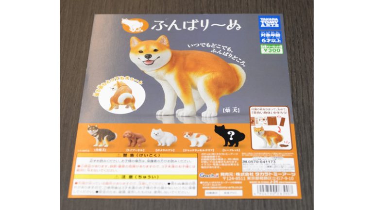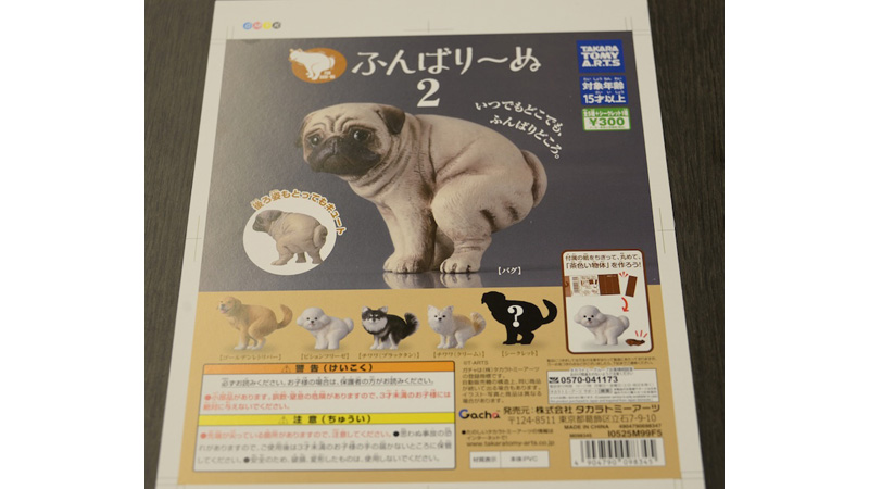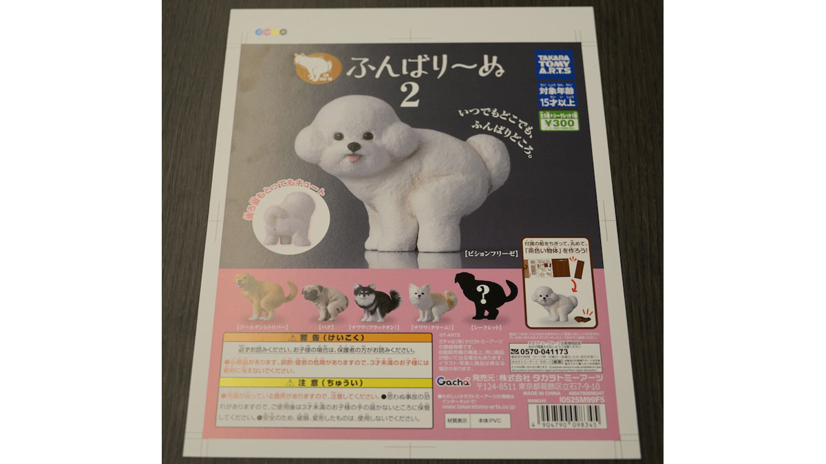 第2弾となる『ふんばり~ぬ2』は人気の高いチワワ(ブラックタン/クリーム)のほか、ビションフリーゼ、ゴールデンレトリバー、パグ、シークレットの計6種。ガチャマシンに差し込む台紙は商品をセットする現場担当者が選べるよう、写真映えするビションフリーゼとパグを表と裏の両面に印刷した。