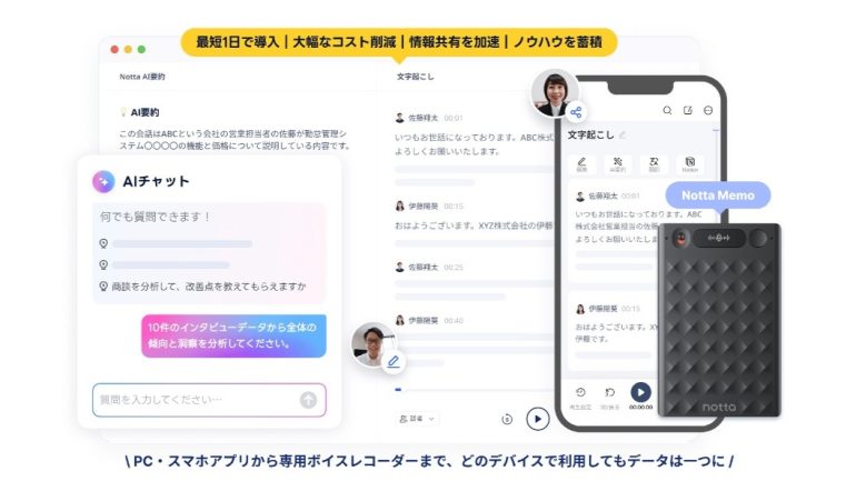 また、Chrome拡張、モバイルアプリ、Apple Watch、専用デバイスなど多様なインターフェースから利用可能で、Google Drive、Microsoft OneDrive、SlackやNotionとも連携。さらに、AI ボイスレコーダー「Notta Memo」と自動連携する。