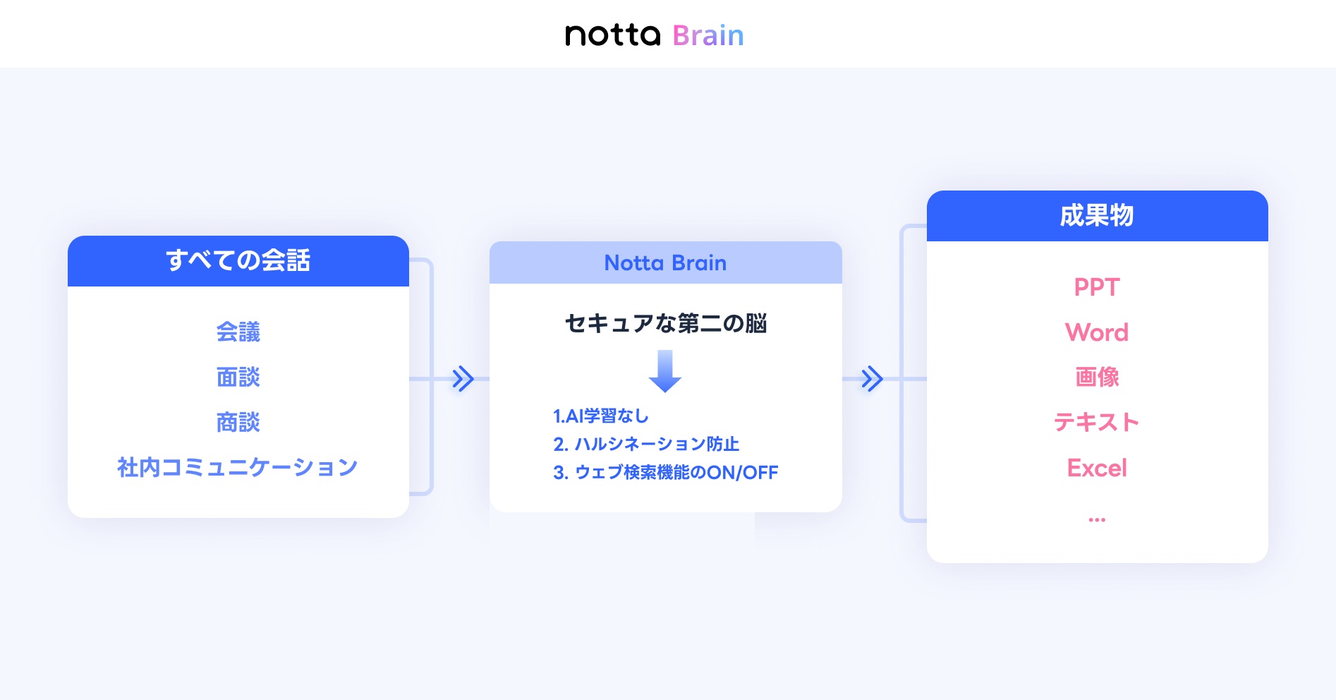 今回登場する「Notta Brain」は、「Notta」に蓄積された議事録データ、外部から取り込む音声ファイルやPDF資料、さらにはインターネット上の公開情報などを横断的に掛け合わせ、高度な解析結果をテキストおよびパワーポイント形式で自動生成する、AIエージェント。音声データを中心とした独自の知識基盤を構築し、考察・提案業務を大幅に効率化する。