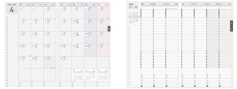 月の予定を一覧できる「月間ブロック」ページと24時間軸を採用した「週間バーチカル」ページを収録。TODOリストやメモが書き込める、情報整理に役立つスペースも備わっている。