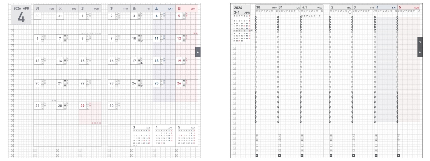 月の予定を一覧できる「月間ブロック」ページと24時間軸を採用した「週間バーチカル」ページを収録。TODOリストやメモが書き込める、情報整理に役立つスペースも備わっている。