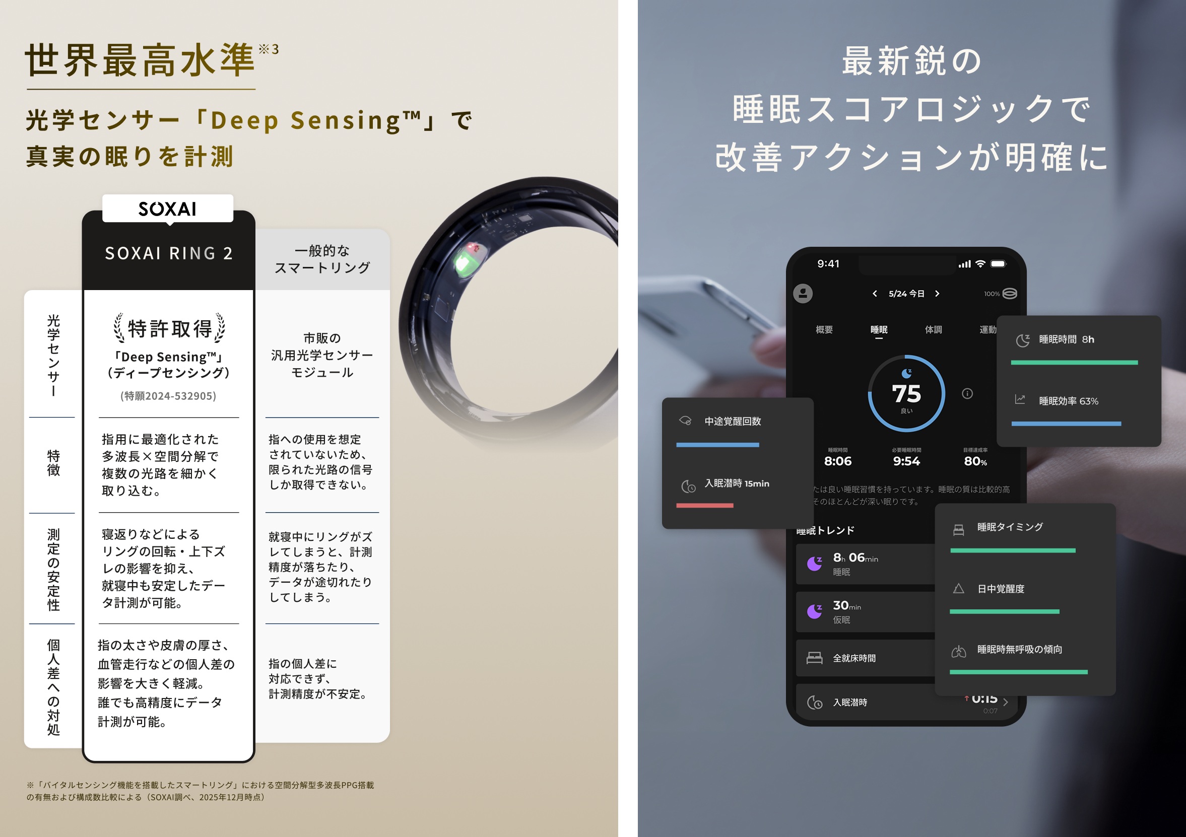 新モデル「SOXAI RING 2」では、特許を取得した光学分野の最先端技術を活用して独自開発した光電容積脈波(PPG)センサー「Deep Sensing」(ディープセンシング)を新たに搭載したことで、計測の精度が大幅に改善し、より深いレベルで身体状態の変化を可視化することができるようになった。