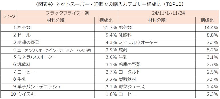 ブラックフライデー週に「ネットスーパー・通販」で購入された食品では、分析期間中の上位10カテゴリーはお茶類やミネラルウォーターなどの飲料類が上位だった。飲料類のランクインは、購入後の持ち帰りの不便さ(重さ)やケース買いの影響が予想される。さらに冷凍の野菜や生麺類もランクインしており、特に冷凍の野菜は購入場所に関わらず経年で出現が増えているカテゴリーで、ブラックフライデー週には3位に入っている。生鮮野菜より比較的価格が安定しているので、タイパ・コスパ意識の高まりで調理工程に時間をかけたくない人が増えていることからニーズは高まっているようだ。