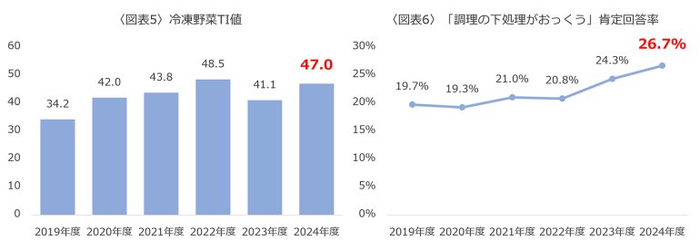 冷凍の野菜が食卓に出されることが徐々に増えており、『食MAP』モニタの「調理の下処理に対し面倒だと感じる意識」も高まっているという。異常気象で生鮮食品の価格が高騰した環境的要因もあるが、生活者の意識の変化から生まれたニーズに冷凍の野菜がマッチしていたことが出現増加の背景にありそうだ。