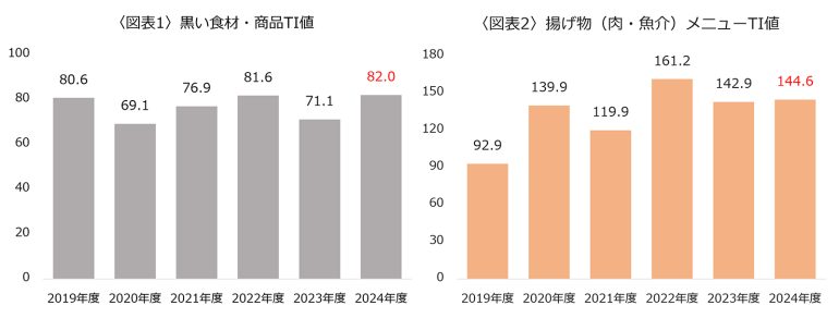 ブラックフライデーは、アメリカ発祥の大型セールイベントで、近年では日本でも浸透してブラックフライデーにちなんだ「黒い食材・商品」や「フライ」の訴求などが行われている。ブラックフライデー当日の黒い食材・商品の出現と夕食における揚げ物メニューの出現を時系列で分析すると、コロナ禍前の2019年度から2024年度にかけて黒い食材・商品TI値(1000食卓あたりの出現数)は横ばいだったが、揚げ物メニューのTI値は2019年度から約1.5倍も増加していた。ブラックフライデーセールの消費者の認知度が高まって、ブラックフライデーの関連メニューの提案に効果があると推測される結果になった。