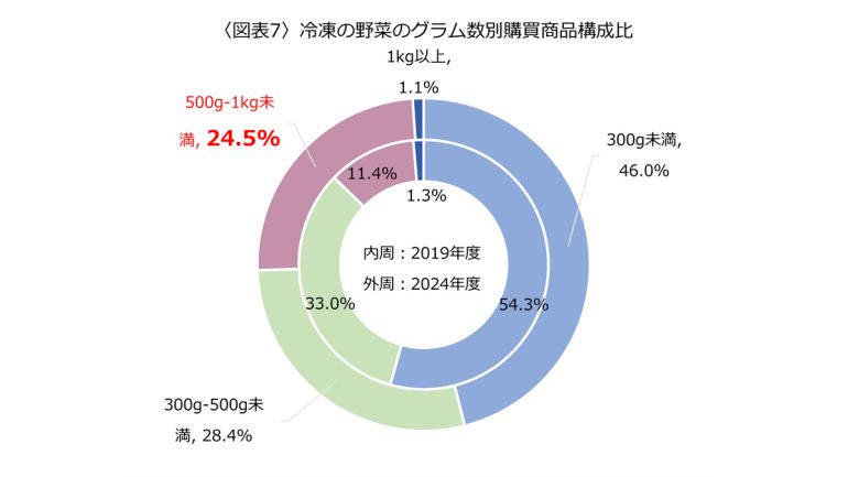 2019年度(コロナ直前)と2024年度で購入された冷凍の野菜商品をグラム数の構成比でみると、2019年度から2024年度にかけて500g-1kg未満の商品の構成比が11.4%から24.5%と2倍以上に増加していることもわかった。