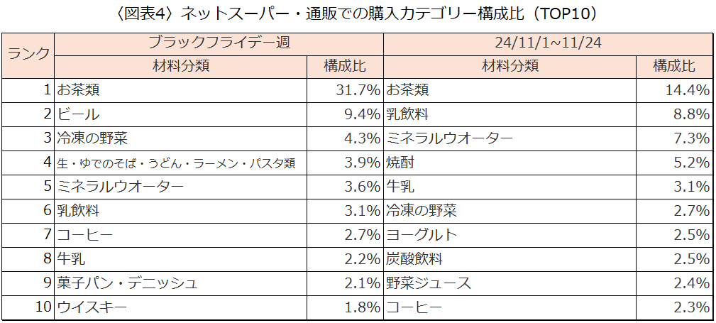 ブラックフライデー週に「ネットスーパー・通販」で購入された食品では、分析期間中の上位10カテゴリーはお茶類やミネラルウォーターなどの飲料類が上位だった。飲料類のランクインは、購入後の持ち帰りの不便さ(重さ)やケース買いの影響が予想される。さらに冷凍の野菜や生麺類もランクインしており、特に冷凍の野菜は購入場所に関わらず経年で出現が増えているカテゴリーで、ブラックフライデー週には3位に入っている。生鮮野菜より比較的価格が安定しているので、タイパ・コスパ意識の高まりで調理工程に時間をかけたくない人が増えていることからニーズは高まっているようだ。