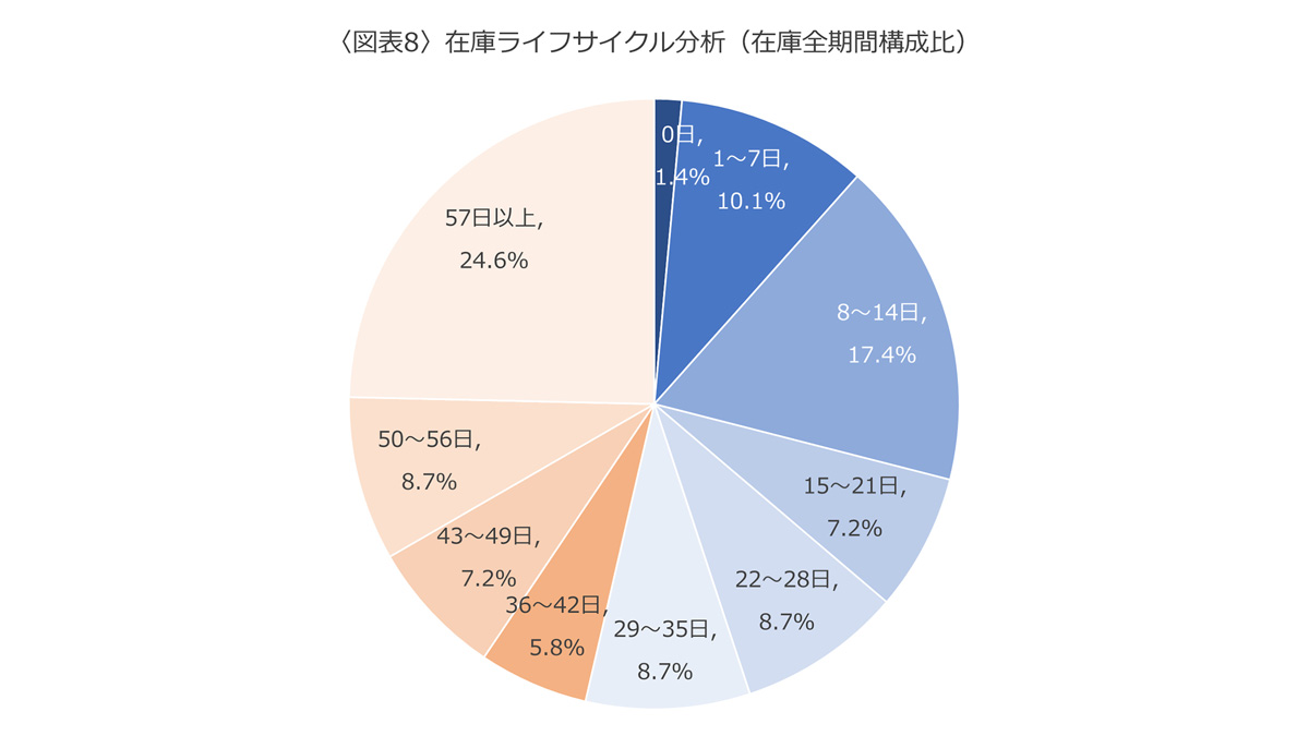 ブラックフライデー週に購入された冷凍の野菜のうち、容量「500g-1kg未満」の商品が購入から使い切りまでにどのくらいの期間を要するのかデータでみると、購入された冷凍の野菜商品(500g-1kg未満)のうち、約半数はその後35日以内に使い切られている。ブラックフライデー週に購入された商品の多くがクリスマスから年末頃には使い切られていると予想でき、冷凍の野菜(大容量商品)は、クリスマス前から年末のブラックフライデーから2週間から1か月後にかけて改めて訴求すれば、在庫がない世帯への継続的な購買タイミングになるかもしれない。販売者の立場に立てば、商品の購入から使い切りまでのライフサイクルを把握することで、適切な時期に訴求して継続的な購入・消費をするユーザーを増やすポイントにできそうだ。