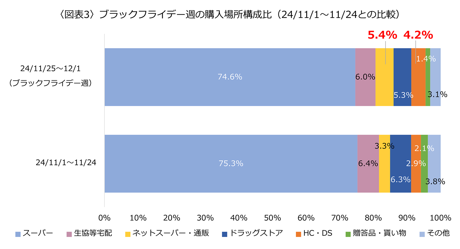 『食MAP』モニタのブラックフライデー週の購入場所を24年11月のブラックフライデー週以外の期間と比較すると、食品の購入はスーパーがメインだったが、ブラックフライデー週は「ネットスーパー・通販」の割合が5.4%だった。これは24年11月のブラックフライデー週以外の期間の3.3%より高く、食品購入にもブラックフライデーのセールが活用されているようだ。